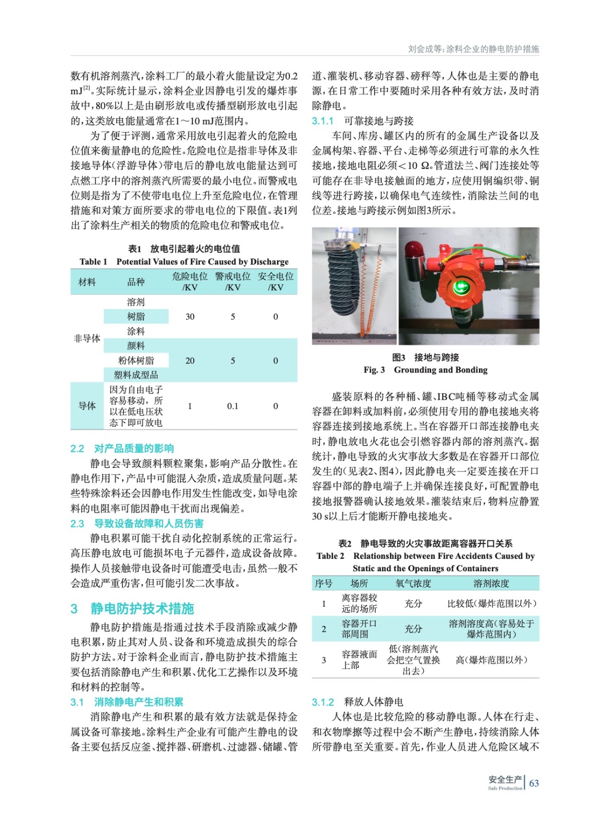 通過分析涂料生產各環節的靜電產生機理及安全事故危害,研究提出了包括工藝控制、設備接地、環境增濕、人員防護等在內的綜合靜電防護措施,并建立了相應的安全管理體系。實踐表明,實施這些措施可顯著降低涂料企業的靜電危害風險。