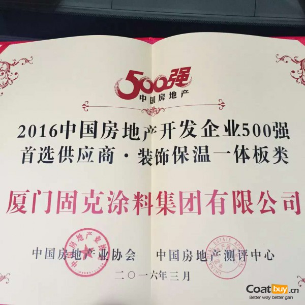 3月22日,“2016中國房地產500強測評成果”在京盛大發布。固克涂料集團旗下兩大品牌“天工石”、“固克漆”以不同凡響的品牌實力同步獲得500強開發商首選品牌供應商,其中“天工石”榮登裝飾保溫一體板類榜單前五強,固克漆再度蟬聯涂料類榜單前10強。固克涂料集團執行總經理林汶輝先生代表公司受邀出席本次盛會。