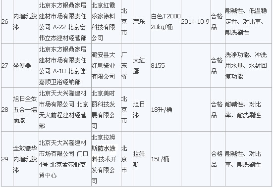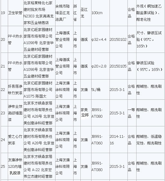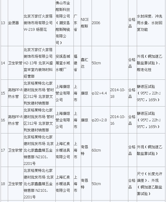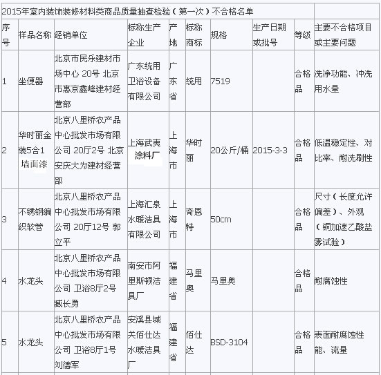 在2015年流通領(lǐng)域商品質(zhì)量抽檢工作中,北京市工商局對北京市市場上銷售的室內(nèi)裝飾裝修材料類商品進(jìn)行了抽檢。抽檢結(jié)果顯示膠粘劑全部合格,發(fā)現(xiàn)水龍頭、軟管、PP-R管、墻漆涂料等類別中標(biāo)稱“統(tǒng)用”、“華時(shí)麗”、“馬里奧”等品牌29種室內(nèi)裝飾裝修材料存在問題,主要問題為衛(wèi)生潔具的洗凈功能、水封深度、沖洗用水量、水封回復(fù)功能項(xiàng)目,水龍頭的表面耐腐蝕性能、流量、管螺紋精度項(xiàng)目,墻漆涂料耐堿性、低溫穩(wěn)定性、對比率、耐洗刷等項(xiàng)目不符合相關(guān)標(biāo)準(zhǔn)要求。