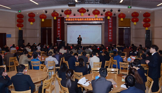 以“環(huán)保涂裝 綠色出行”為主題的中國自行車、電動車水性涂裝高峰論壇4月12日在晨陽水漆舉行。晨陽水漆高層領(lǐng)導(dǎo),中國自行車協(xié)會培訓(xùn)中心主任鄭培東,全國自行車工業(yè)信息中心副主任國長軍, 100余家自行車、電動車廠家領(lǐng)導(dǎo)和代表參加,共商水性涂裝發(fā)展大計。