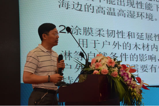 來自北京化工大學同時又是中國水性木器涂料產業聯盟專家委員會主任的何立凡教授帶來了《高性能戶外水性木器漆研制及應用》的報告。戶外家具包括門窗、欄桿、桌椅、棧道等木結構材料,范圍十分廣泛,因為在室外,故而對耐水性、耐候性有較高的要求。何教授認為,選用耐候性優異的樹脂體系、設計合理的粒子結構、采用反應適中的交聯單體、配合多效的助劑、建立完整的涂裝體系,就能夠得到優異的水性木器涂料,成功應用在戶外家具上。