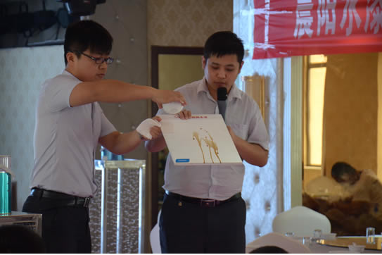 當(dāng)天,還舉行了晨陽(yáng)水漆產(chǎn)品推廣會(huì)。晨陽(yáng)水漆培訓(xùn)部員工介紹了公司的歷史背景、水漆未來(lái)的發(fā)展趨勢(shì)、國(guó)家相關(guān)扶持政策和2015年品牌發(fā)展方向?,F(xiàn)場(chǎng),通過產(chǎn)品試刷和養(yǎng)金魚試驗(yàn),油工師傅們對(duì)晨陽(yáng)水漆產(chǎn)品環(huán)保特性和施工效果表示肯定。